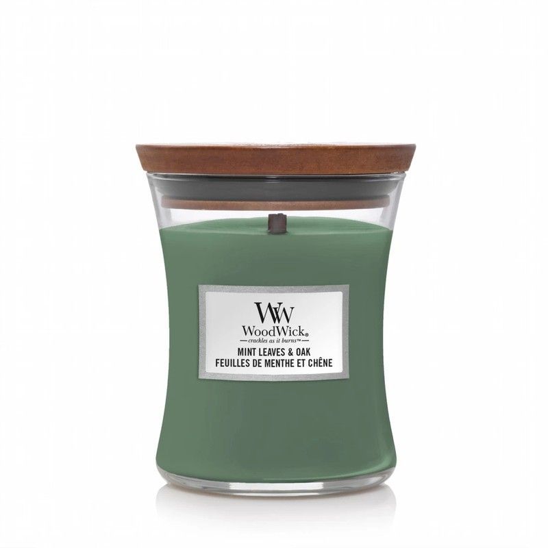 Vela mediana WoodWick con aroma a hojas de menta y roble, ideal para crear un ambiente relajante en casa. Con mecha de madera que produce un suave crujido al arder, esta vela de cera de alta calidad ofrece una fragancia fresca y natural. Perfecta para salones, dormitorios o espacios de bienestar. Diseño elegante en frasco de vidrio con tapa de made