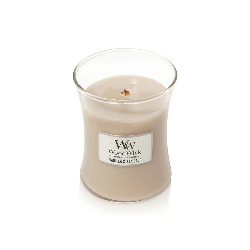 Vela mediana WoodWick con aroma a Vainilla & Sea Salt, ideal para crear un ambiente cálido y acogedor en tu hogar. Con mecha de madera que cruje al arder, ofrece una experiencia sensorial única. Fabricada con cera de alta calidad, perfecta para espacios de estar, dormitorios o salas de estar. Un toque de elegancia y bienestar para tu decoración.