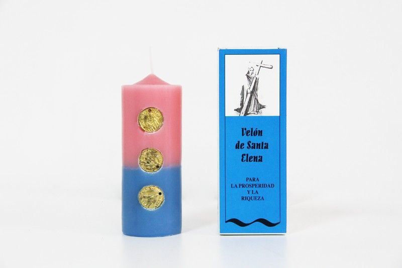 Velón preparado Santa Elena, ideal para rituales de prosperidad y riqueza. Con diseño en gradiente rosa y azul, adornado con tres monedas doradas simbólicas. Incluye caja rectangular azul con ilustración de la santa. Producto espiritual para uso en hogar o ceremonias de intención positiva.