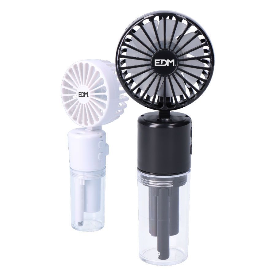 Ventilador nebulizador recargable con 4 velocidades, ideal para uso diario en casa, oficina o viajes. Diseño compacto y portátil con base transparente y depósito de agua integrado. Fabricado en plástico y metal, ofrece una brisa fresca y humectante. Disponible en blanco y negro. Perfecto para mantener la frescura en días calurosos.