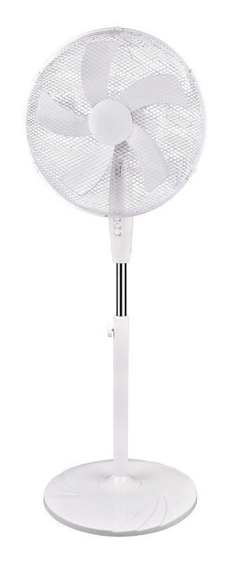 Ventilador de pie inclinable con 5 velocidades, ideal para hogar y oficina. Diseño elegante en blanco, con base estable y columna ajustable. Fabricado en plástico y metal, ofrece un flujo de aire potente y silencioso. Perfecto para mantener la frescura en cualquier espacio.