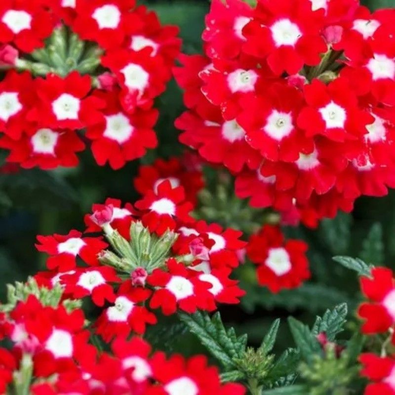 Verbena híbrida rastrera en caja de 10 unidades, ideal para jardines, balcones y macetas. Flores rojas con centro blanco y follaje verde intenso. Crecimiento compacto y duradero, perfecto para bordes, terrazas y espacios exteriores. Fácil de cuidar y resistente a plagas. Aporta color y vida a tu espacio verde.