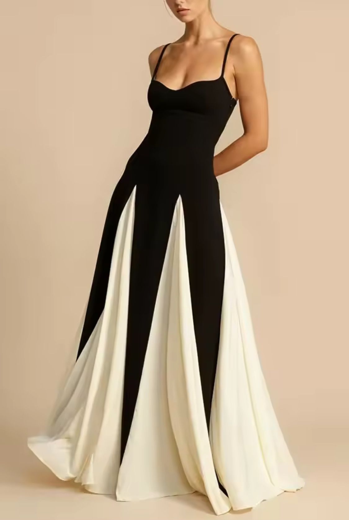 Vestido largo con escote en forma de corazónTirantes finosCorte ajustado en la parte superiorFalda amplia con paneles blancos y negrosDiseño asimétrico con aberturas laterales
