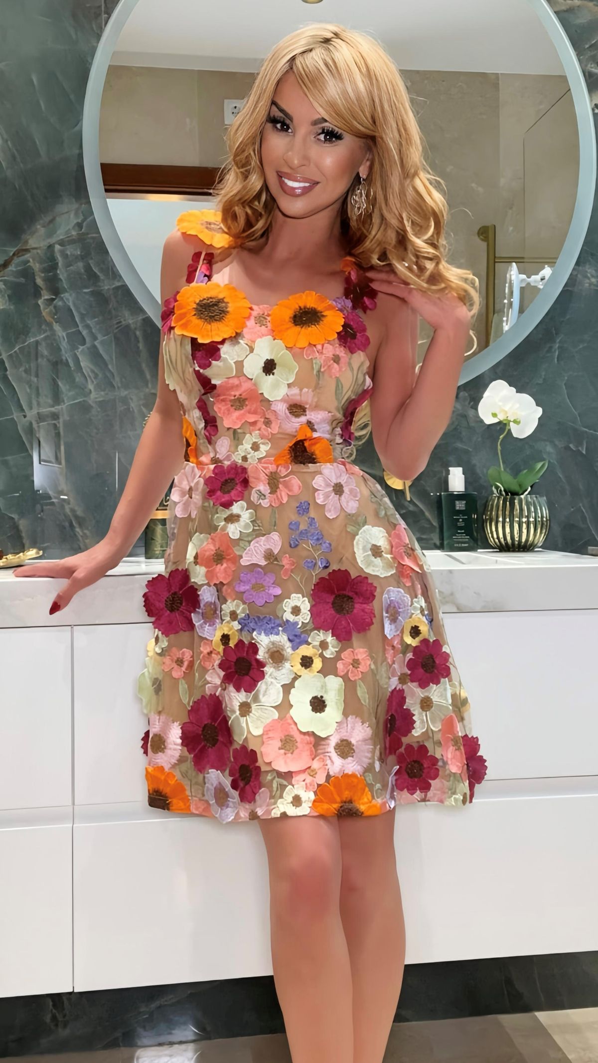 Vestido modelo Sicilia con diseño floral tridimensional en colores vibrantes como naranja, rosa, rojo y morado sobre tela semitransparente. Ideal para ocasiones especiales, fiestas o eventos elegantes. Confeccionado en poliéster de alta calidad, ofrece un ajuste femenino y un look sofisticado. Perfecto para mujeres adultas que buscan destacar con e