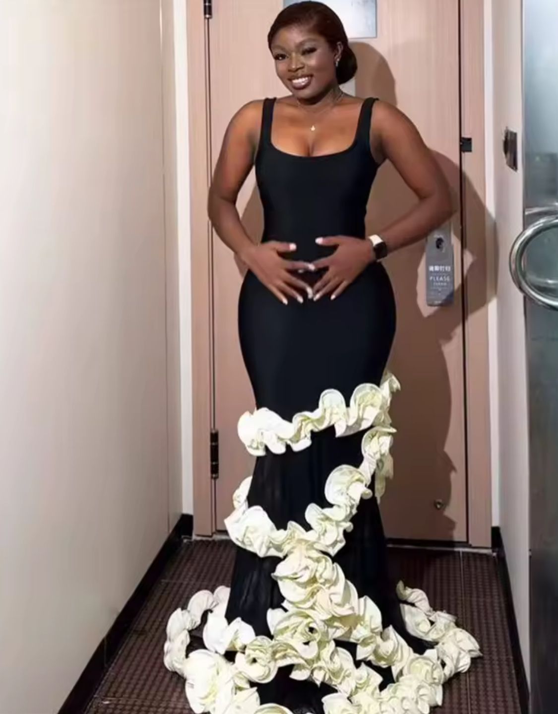 Vestido modelo Singapur en color negro con detalles de volantes blancos en forma de flores que decoran la falda desde la rodilla hasta el suelo. Corte sirena ajustado que realza la figura, escote en corazón y sin mangas. Ideal para eventos elegantes y noche. Confeccionado en poliéster y algodón para mayor comodidad y caída. Perfecto para mujeres ad