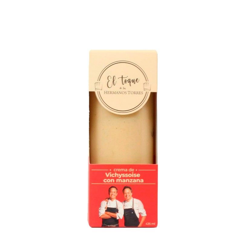 Crema de Vichyssoise con manzana de 435 ml de la marca El Toque de los Hermanos Torres. Presentada en una caja rectangular con ventana transparente que muestra su textura cremosa y color beige. Ideal para acompañar platos fríos o como entrada gourmet. Un toque de sabor único con la combinación tradicional de Vichyssoise y la frescura de la manzana.