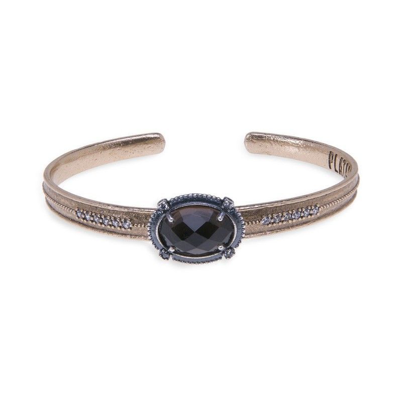 Pulsera elegante para mujer en metal plateado con diseño de cierre abierto. Destaca por su piedra central de cuarzo negro facetado, rodeada de cristales negros y detalles de incrustaciones a lo largo de la banda. Ideal para looks sofisticados y combinaciones con vestidos o atuendos formales. Calidad premium y acabado pulido que resalta su estilo fe