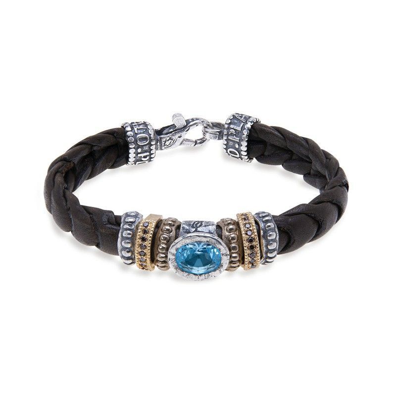 Pulsera WB322A para mujer con cuerda trenzada de cuero negro y detalles metálicos en plateado y dorado. Destaca por su piedra ovalada azul en el centro, ideal para looks elegantes o casuales. Diseño sofisticado y resistente, perfecta para complementar tu estilo diario o en ocasiones especiales.