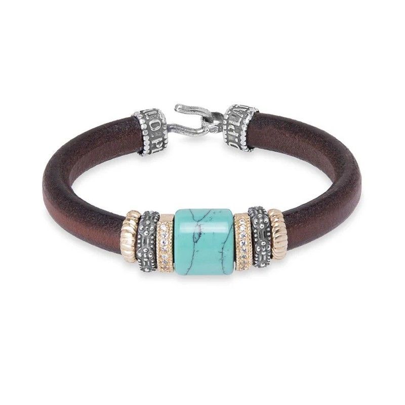 Pulsera WB379X de cuero marrón con resina turquesa y detalles metálicos plateados y dorados. Diseño bohemio y sofisticado, ideal para adultos que buscan un toque de estilo y elegancia. Perfecta para combinar con looks casuales o semi-formales. Materiales de calidad para un uso diario duradero.