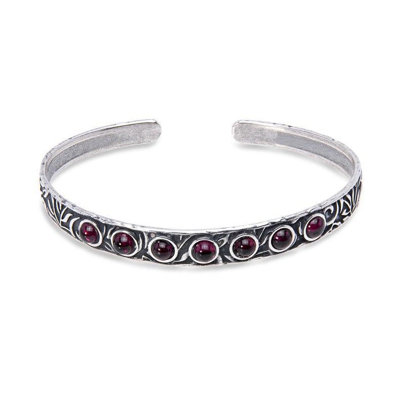 Pulsera Gaia para mujer en plata de palo con siete cabujones de granate natural de 4 mm. Diseño elegante con motivos de hojas grabadas y acabado antiguo. Ideal para complementar looks sofisticados o diarios. Joyería de calidad con toque bohemio y femenino.