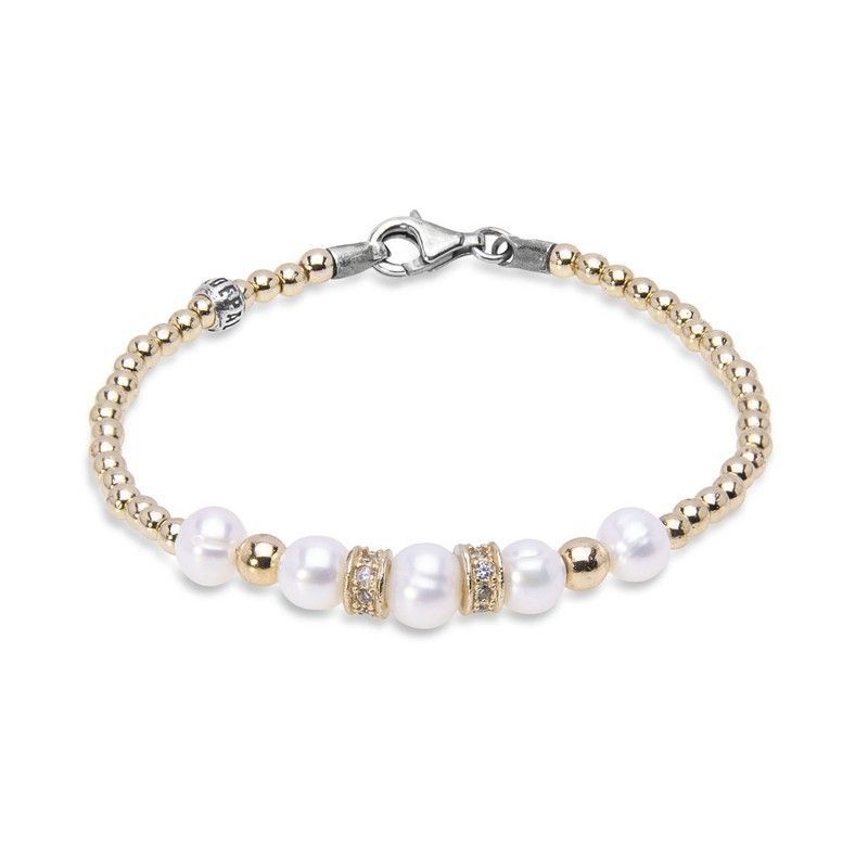 Pulsera Lyra WB389X para mujer, con perlas de agua dulce blancas y detalles en metal dorado con circonitas. Cadena de esferas metálicas y cierre de mosquetón plateado. Ideal para looks elegantes y diarios. Joyería fina y sofisticada para mujeres que buscan un toque de distinción.