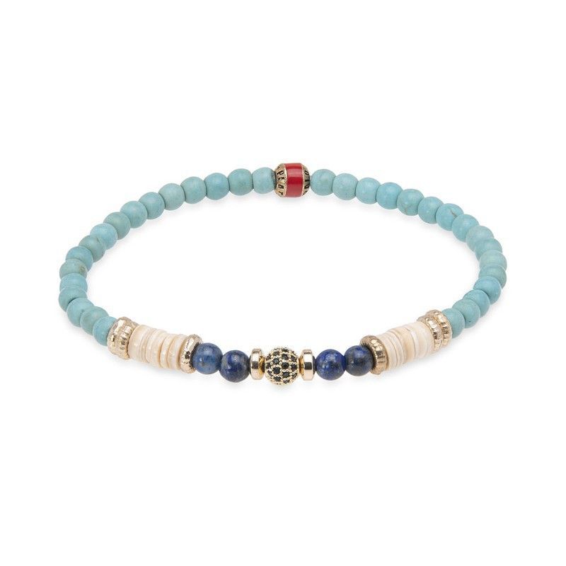 Pulsera WB396B de la serie Vena, ideal para mujer, con cuentas de turquesa y lapislázuli. Diseño elegante con detalles dorados y una cuenta roja que aporta un toque de contraste. Fabricada con materiales naturales y acabados metálicos, perfecta para combinar con cualquier look casual o sofisticado. Ideal para quienes buscan joyería con estilo y sig