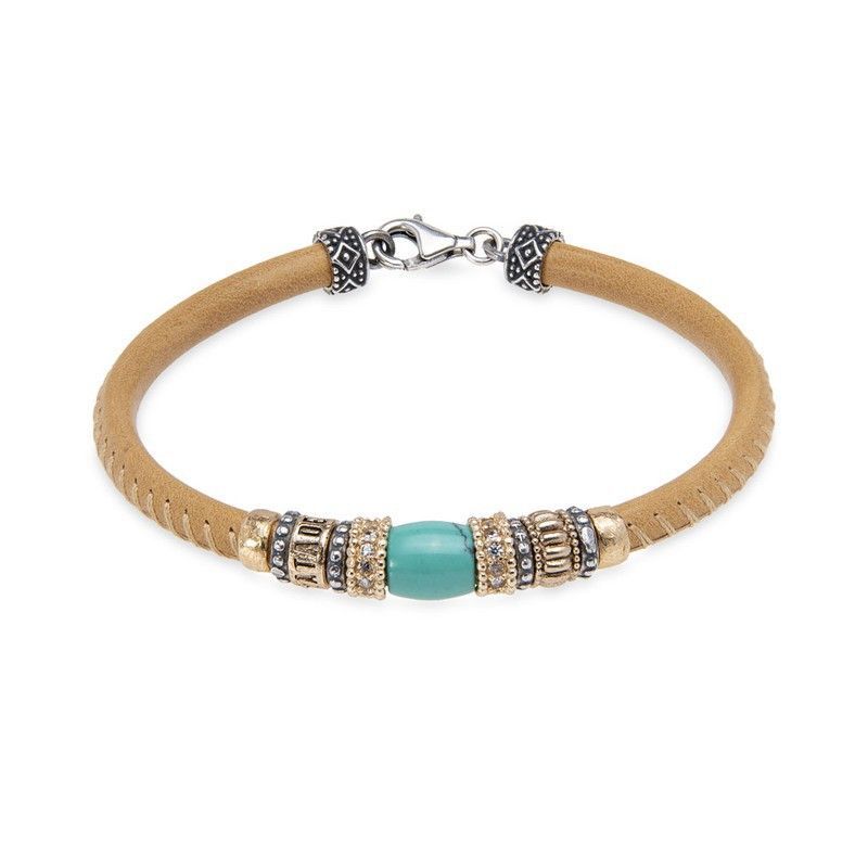 Pulsera WB405X para mujer con cordón de cuero camel fino y elegante, ideal para looks discretos y sofisticados. Destaca por su diseño con cuentas metálicas doradas y plateadas con cristales, y una piedra central turquesa. Cierre de mosquetón con detalles ornamentales. Perfecta para combinar con cualquier atuendo diario o especial.