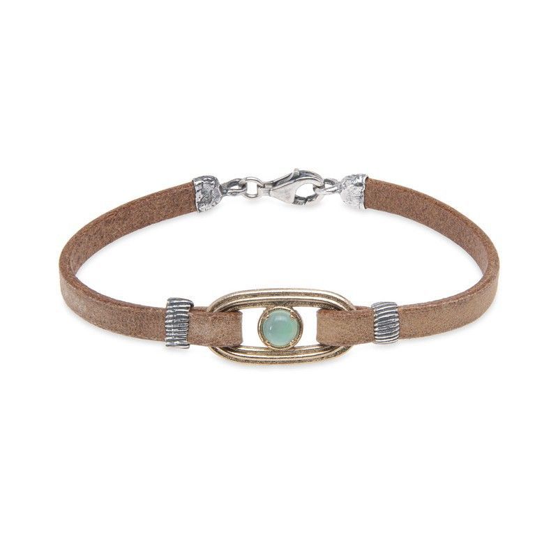 Pulsera WB409X para mujer con banda de cuero plano color camel de 5 mm, eslabón central de bronce con cabujón de calcedonia y cierre de mosquetón plateado. Diseño elegante y sofisticado, ideal para complementar looks casuales o formales. Materiales de calidad para un uso diario duradero.