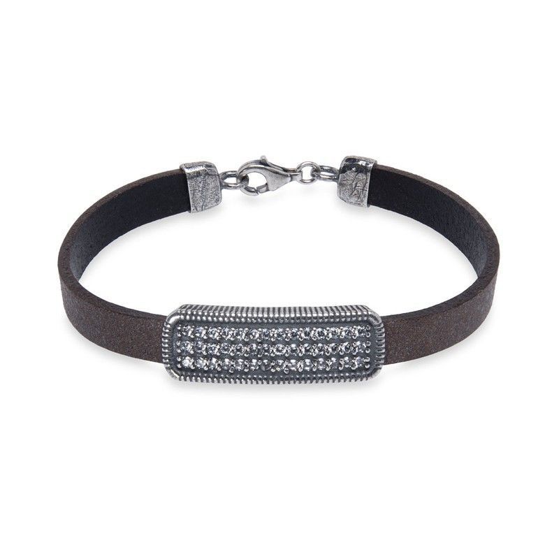 WB424X Pulsera Plata de Palo mujer elegante de cuero con pieza de Plata 925 y circonitas blancas exquisita pieza de alta joyería