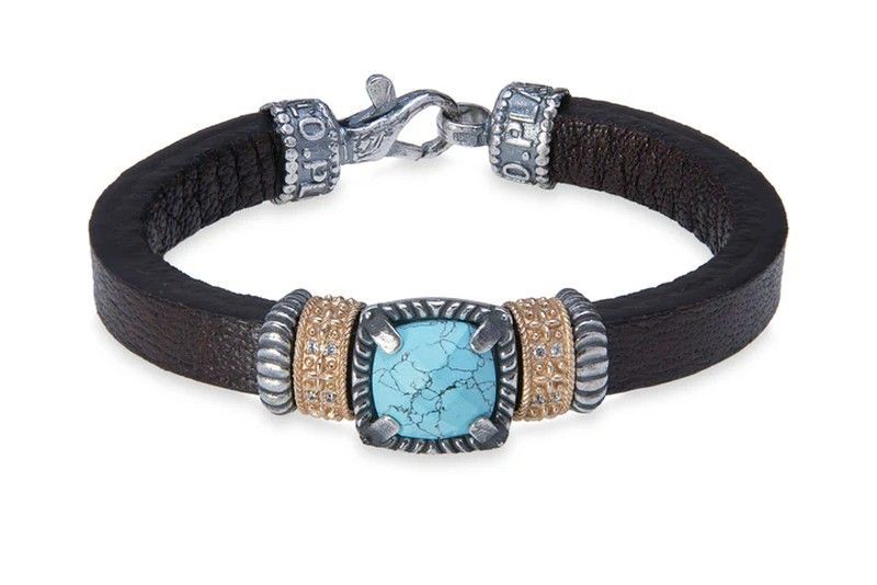 Pulsera WB447X para mujer con diseño sofisticado en cuero negro y piedra de calcedonia azul. Detalles metálicos plateados y dorados con acabado texturizado. Ideal para looks elegantes o diarios, combina estilo y calidad. Cierre seguro tipo mosquetón. Joyería perfecta para regalar o lucir con cualquier atuendo.