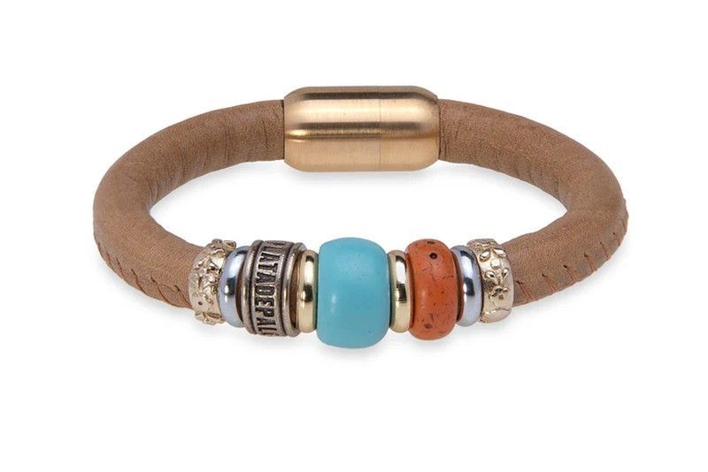 Pulsera WB462X para mujer con diseño sofisticado en cuero marrón, resinas azul y naranja y detalles metálicos plateados y dorados. Cierre magnético fácil de usar. Ideal para eventos casuales o formales, combina estilo y comodidad. Un accesorio versátil que realza cualquier look.