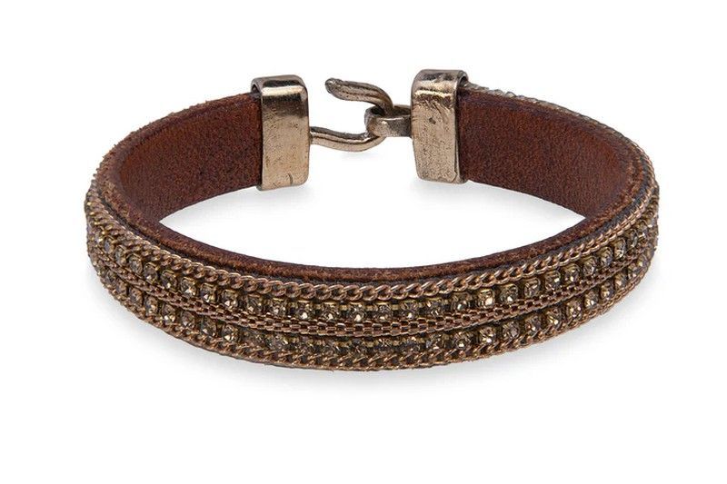 Pulsera WB473X de la colección Jasira, con diseño elegante en cuero marrón y detalles de pasamanería con cristales plateados. Ideal para adultos que buscan un toque sofisticado en su look diario o para ocasiones especiales. Cierre metálico seguro y acabado de alta calidad. Perfecta para combinar con otros accesorios de estilo clásico o moderno.