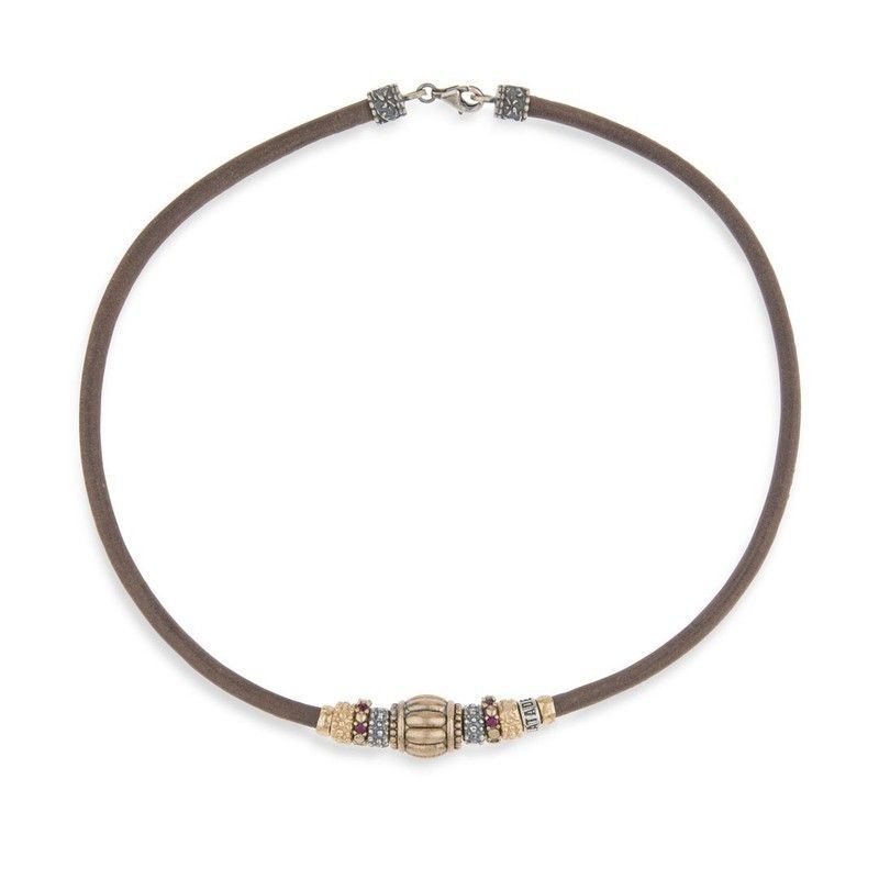 Collar WN074X de la colección Malthe, diseñado para mujer. Con cuerda de cuero marrón y detalles metálicos dorados y plateados con incrustaciones, ofrece un look elegante y sofisticado. Ideal para combinar con vestidos o looks formales. Calidad premium, perfecto para regalar o lucir en ocasiones especiales.