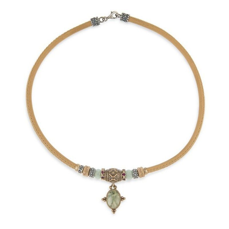Collar WN077X con cuerda de cuero marrón y colgante de prehnita verde, detalles en plata de ley con incrustaciones. Diseño elegante y sofisticado, ideal para adultos que buscan joyería con toque natural y bohemio. Perfecto para combinar con looks casuales o semi-formales.