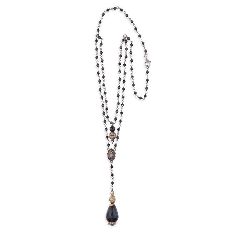 Collar WN080X de mujer con diseño de rosario, elaborado en metal con acabado plateado y bronce, y cuentas de ónix negro. Ideal para looks elegantes y sofisticados, combina perfectamente con vestidos o blusas formales. Su colgante central y pendiente en forma de gota aportan un toque distintivo y femenino. Perfecto para ocasiones especiales o como c