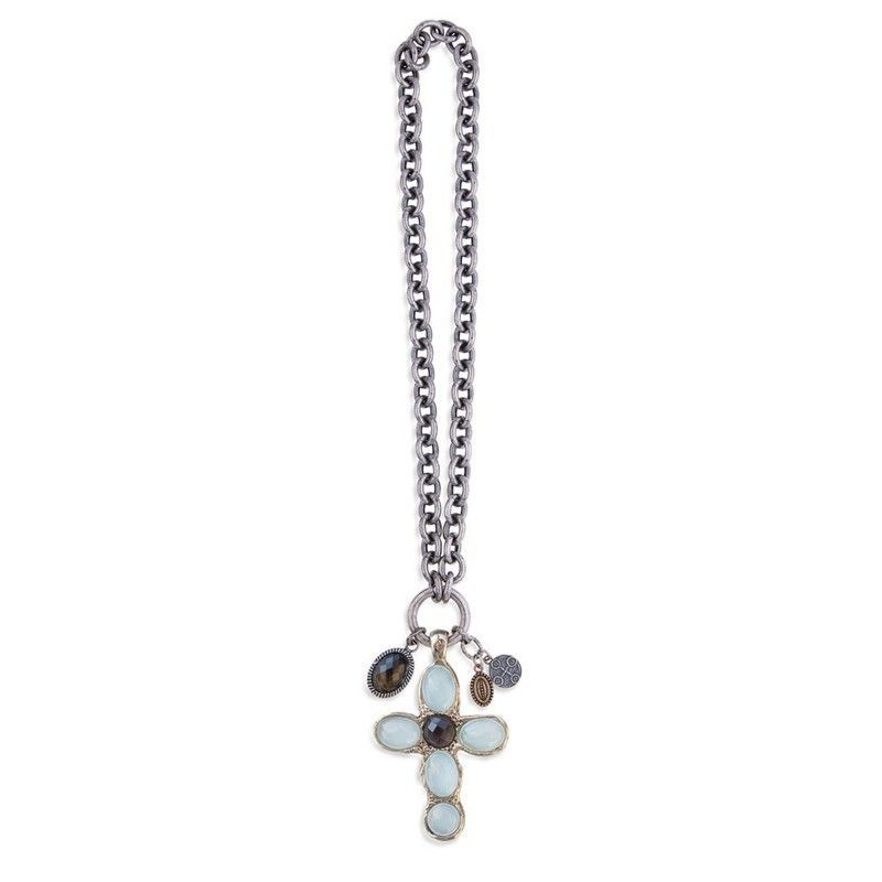 Collar WN101X de PLATADEPALO para mujer, elaborado en plata de ley 925 con colgante en forma de cruz adornado con piedras semipreciosas de tonos blancos, grises y negros. Diseño elegante y delicado, perfecto para complementar looks diarios o especiales. Ideal para amantes de la joyería fina con toques espirituales.