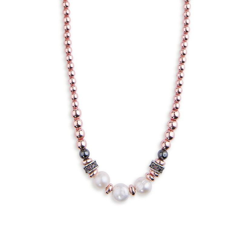 Collar WN133R modelo CARLA para mujer, con cadena de eslabones en tono rosa y detalles de perlas blancas y diamantes negros. Diseño elegante y sofisticado, ideal para looks formales o semi-formales. Fabricado en metal de alta calidad, perfecto para regalar o lucir en ocasiones especiales.
