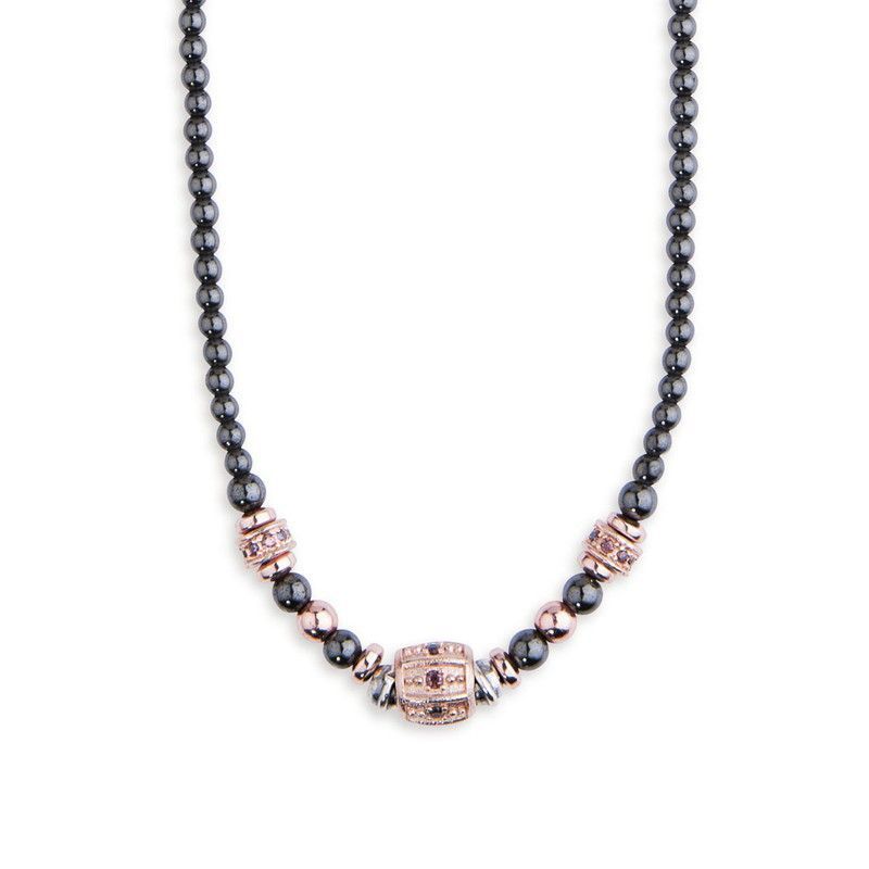 Collar WN135N de plata de palo con bolas de ematite negra y detalles en tono rosa dorado. Diseño elegante y sofisticado ideal para mujeres que buscan un toque de distinción. Perfecto para combinar con looks formales o semi-casuales. Materiales de calidad que garantizan durabilidad y brillo.
