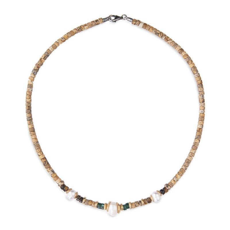 Collar WN159M modelo TERNA para mujer, elaborado con plata de palo y jaspe en tonos naturales, adornado con tres perlas de agua dulce blancas. Diseño elegante y minimalista, ideal para looks diarios o semi-formales. Cierre seguro de mosquetón plateado. Joyería fina con toques orgánicos y sofisticados.