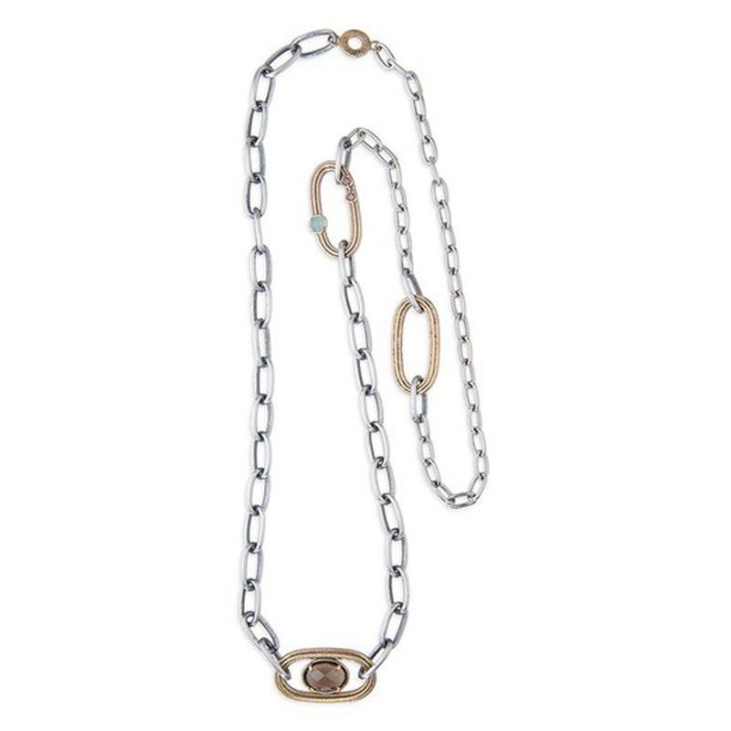 Collar WN220X Frango, elegante y sofisticado, fabricado en plata 925 y bronce. Diseño largo con cadena de eslabones rectangulares y detalles dorados. Elemento central ovalado con piedra marrón que aporta un toque distintivo. Ideal para mujeres que buscan joyería de calidad con estilo versátil para ocasiones especiales o diarias.