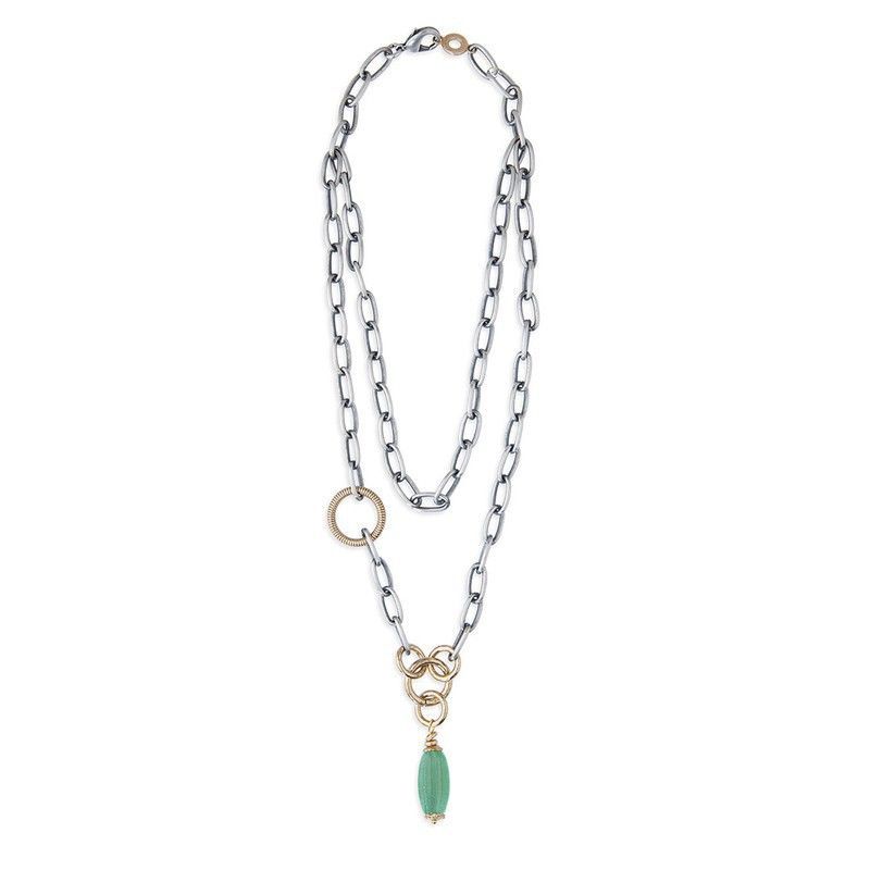 Collar WN221X para mujer en plata de ley con detalles en bronce dorado y pieza colgante de cristal verde. Diseño elegante y minimalista, ideal para looks sofisticados. Cadena de eslabones rectangulares con anillo circular dorado y colgante en forma de pera. Perfecto para combinar con vestidos o blusas de estilo urbano o formal.