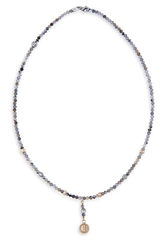 Collar WN232B de la colección Fynara, elaborado en plata 925 con cuentas de piedras semipreciosas en tonos grises y plateados. Incluye un colgante circular con acabado dorado que aporta un toque sofisticado. Diseño elegante y minimalista, perfecto para mujeres que buscan joyería de calidad para uso diario o eventos especiales. Ideal para combinar c