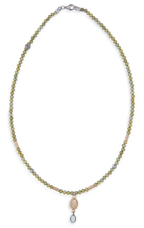 Collar Tessara para mujer en plata de ley 925 con cuentas de piedras semipreciosas de tono verde. Diseño elegante y sofisticado con colgante ovalado en oro rosa y piedra central. Ideal para looks formales o diarios con toque de distinción. Cierre seguro tipo mosquetón. Joyería de calidad para mujeres que buscan estilo y sofisticación.
