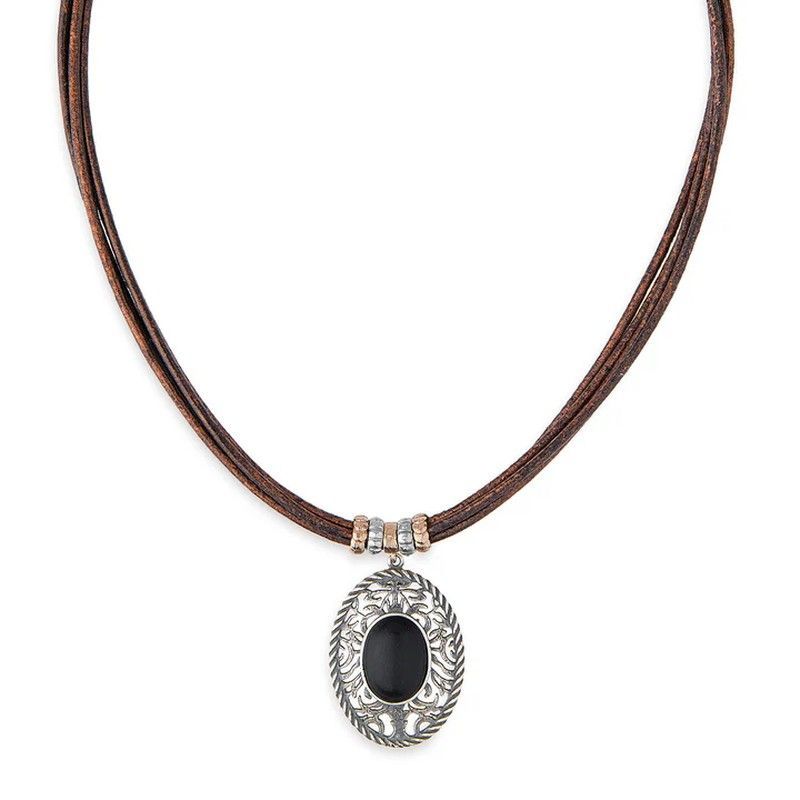 Collar Cobira WN234X para mujer en plata con piedra ébano, diseño moderno y versátil. Cuerda de cuero marrón trenzada y pendiente ovalado con detalles en plata y piedra negra. Ideal para looks elegantes o casuales, combina con cualquier atuendo. Calidad duradera y estilo sofisticado.