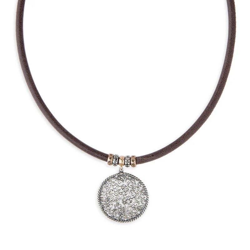 Collar WN236X Alpina para mujer, elegante y sofisticado, con cuerda de cuero marrón y colgante circular en plata de ley 925 con diseño artesanal de motivos florales. Ideal para looks formales o semi-formales, combina estilo y calidad. Un accesorio único que destaca por su acabado fino y detalles metálicos.