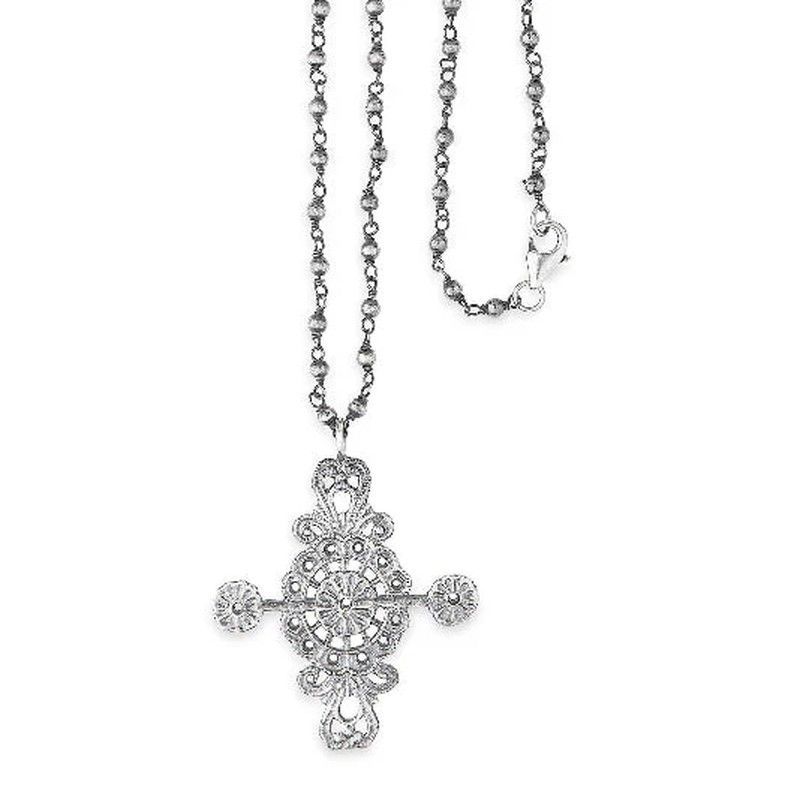 Collar Castana WN238X con cruz en plata de ley 925 y cadena chapada en plata. Diseño elegante y sofisticado con detalles ornamentales en estilo barroco. Ideal para mujeres que buscan joyería de calidad con toque religioso y femenino. Perfecto para ocasiones especiales o como regalo significativo.