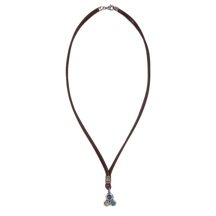 Collar Kaiko para mujer con cuerda de cuero marrón y colgante de plata 925 con piedras naturales: aguamarina, verde y olivina. Diseño elegante y sofisticado, ideal para looks diarios o especiales. Combina estilo y calidad en un accesorio versátil para mujeres que aman la joyería fina con toques naturales.
