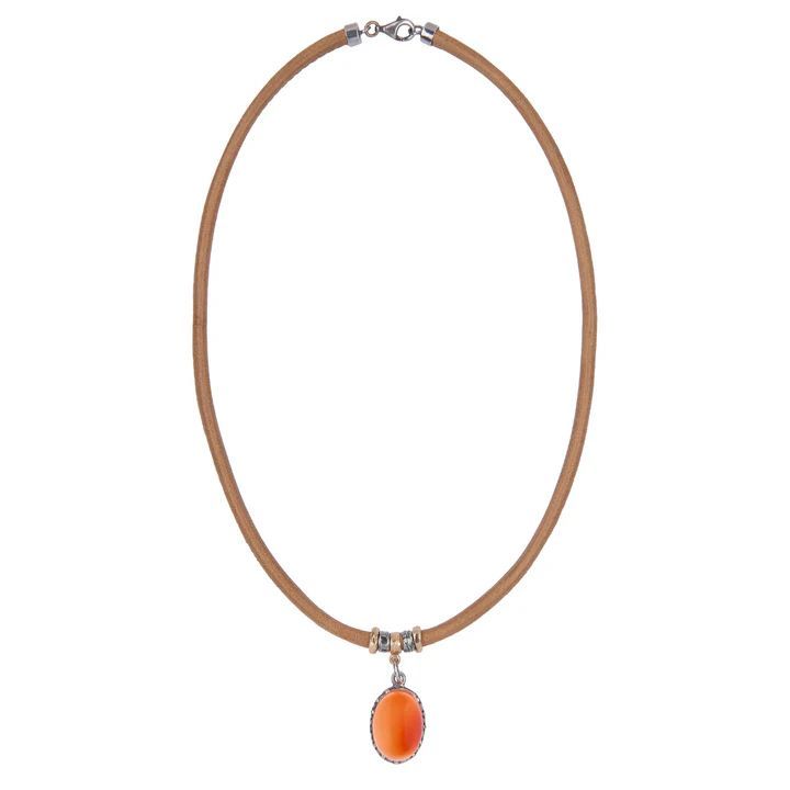 Collar WN255X Rin para mujer, con cuerda de cuero color camel y colgante de cornalina naranja en forma ovalada, montado en plata de ley. Diseño elegante y minimalista, ideal para looks sofisticados o diarios. Perfecto para combinar con cualquier atuendo y aportar un toque de estilo natural y sofisticado.