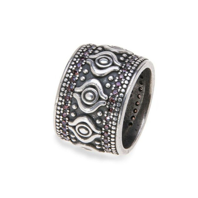 Anillo WR064X de plata de ley con diseño tribal y acabado antiguo, ideal para mujeres que buscan un toque sofisticado y distintivo. Destaca por sus motivos circulares grabados, detalles en relieve y pequeñas incrustaciones de piedras oscuras. Un accesorio versátil para looks elegantes o bohemios.