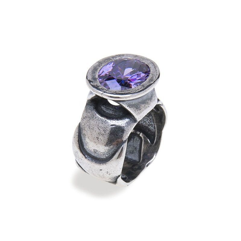 Anillo WR081M en plata de ley con amatista, ideal para adultos que buscan joyería con estilo sofisticado y detalles artesanales. Su diseño robusto y texturizado destaca por la piedra violeta facetada, combinando elegancia y originalidad. Perfecto para complementar looks formales o casuales con un toque distintivo.