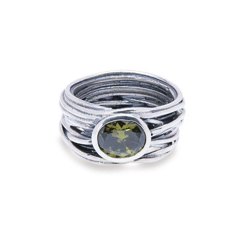 Anillo WR083V CLARI para mujer en plata de ley con piedra de olivina verde. Diseño sofisticado con múltiples bandas entrelazadas y acabado mate. Ideal para looks elegantes y modernos. Joya de calidad perfecta para regalar o lucir en ocasiones especiales.