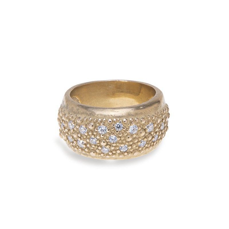 Anillo WR084X ANITA para mujer, exquisito y refinado, fabricado en metal dorado con incrustaciones de diamantes en múltiples filas. Su textura granulada y diseño sofisticado lo convierten en un accesorio ideal para ocasiones especiales. Combina elegancia y brillo para realzar cualquier look femenino.