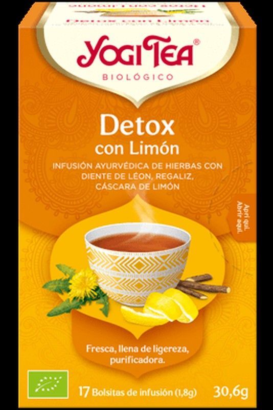 Yogi Tea Detox con Limón, infusión ayurvédica biológica en 17 bolsitas de 1,8g. Ideal para purificar el cuerpo y sentirse ligero. Con diente de león, regaliz y cáscara de limón, esta infusión fresca y natural ayuda a desintoxicar. Perfecta para momentos de bienestar diario. Embalaje ecológico y sostenible.