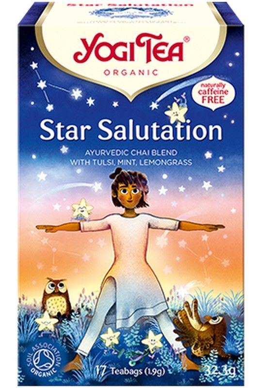 Yogi Tea Star Salutation, una infusión ayurvédica orgánica sin cafeína, ideal para momentos de relajación y bienestar. Con tulsi, menta y hierba limón, esta mezcla de té chai se presenta en una caja rectangular con diseño ilustrado de yoga y estrellas. Perfecta para adultos que buscan una bebida natural y aromática para el cuidado diario del cuerpo