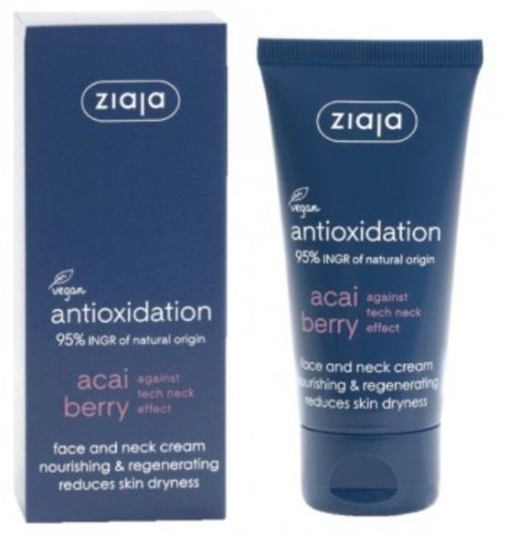 Crema regeneradora y nutritiva para rostro y cuello Ziaja Acai Berry, con 95% de ingredientes de origen natural. Fórmula vegana que combate el efecto 'tech neck' y reduce la sequedad cutánea. Ideal para pieles secas y sensibles que buscan hidratación profunda y antioxidante. En tubo de 50 ml, con diseño elegante en azul oscuro.