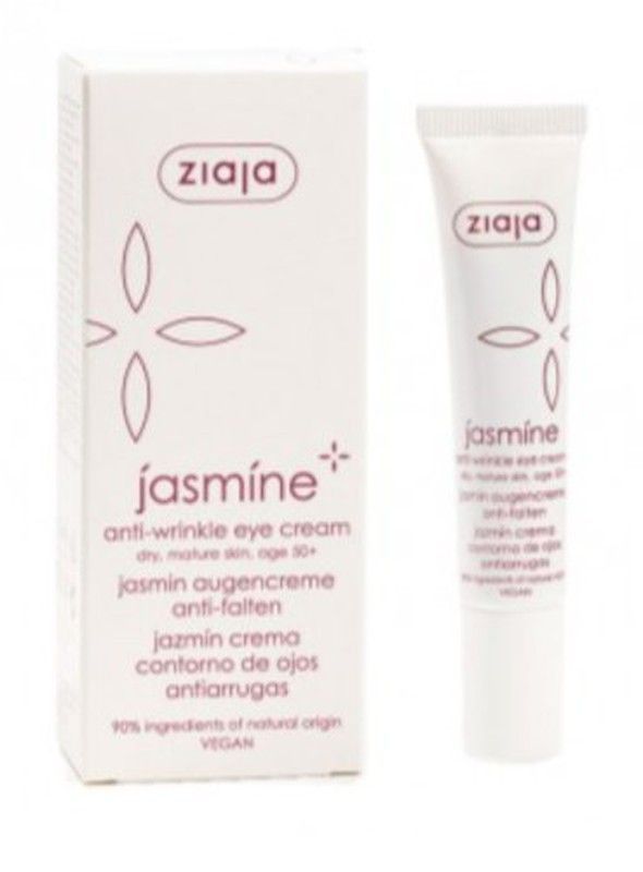 Ziaja Jazmin Contorno de Ojos Antiarrugas, 15 ml. Crema formulada para pieles secas y maduras a partir de los 50 años. Con 90% de ingredientes de origen natural y certificada vegana, ayuda a reducir la apariencia de arrugas y líneas finas alrededor de los ojos. Presentada en tubo blanco con elegante diseño rosa claro y caja rectangular. Ideal para