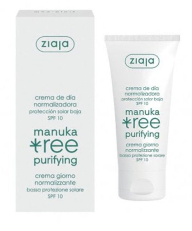 Crema de día normalizadora Ziaja Manuka *ree Purifying con protección solar baja SPF 10, ideal para pieles grasas o mixtas. Formulada para purificar y equilibrar la piel, reduce el brillo y ayuda a controlar la producción de sebo. Presentada en tubo blanco con diseño limpio y minimalista. Perfecta para uso diario en rutinas de cuidado facial.