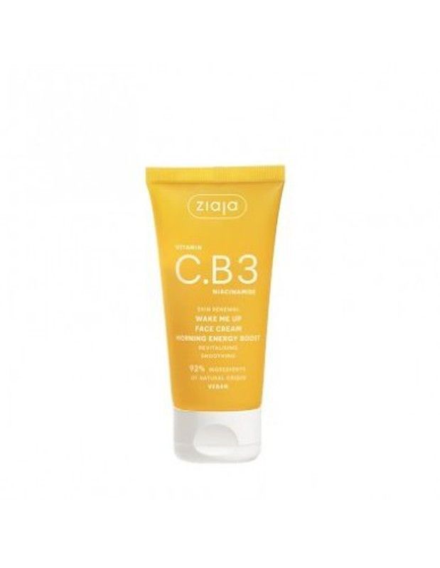 Crema facial revitalizante Ziaja con Vitamina C y B3 para despertar la piel por la mañana. Ideal para pieles cansadas, con efecto energizante y luminosidad. Fórmula con 12% de vitamina C natural y ácido hialurónico. Aplicar diariamente en la cara y cuello. Tubo de plástico con diseño naranja y blanco.