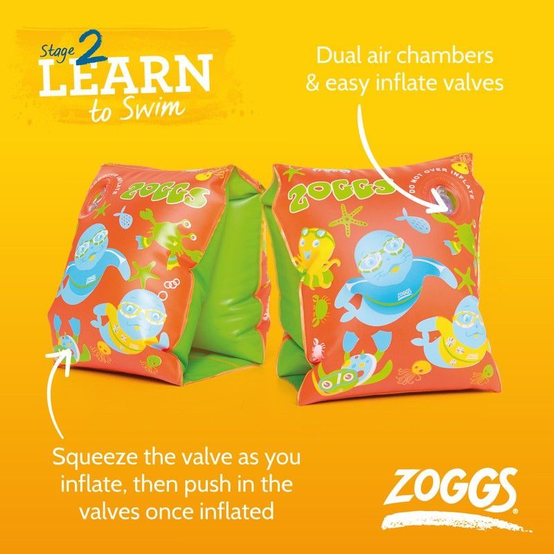 Brazales inflables Zoggs Zoggy para niños en etapa 2 de aprendizaje de natación. Con diseño divertido de personajes marinos en colores naranja y verde, cuentan con dos cámaras de aire y válvulas fáciles de inflar. Ideales para niños que comienzan a nadar con seguridad y diversión en la piscina o playa.