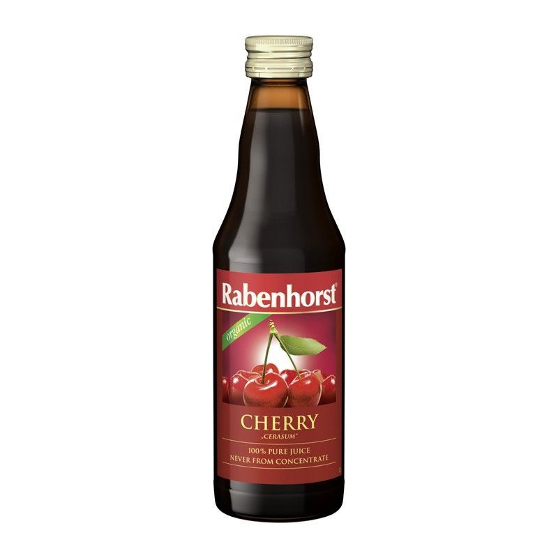 Zumo ecológico de cereza Rabenhorst en botella de 330 ml. Ideal para disfrutar de un sabor natural y refrescante, perfecto para acompañar tus comidas o como bebida saludable diaria. Con un diseño atractivo y etiqueta con imagen de cerezas frescas, este zumo es una opción pura y sin aditivos. Ideal para adultos que buscan productos naturales y de ca